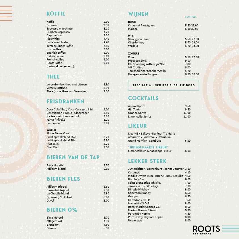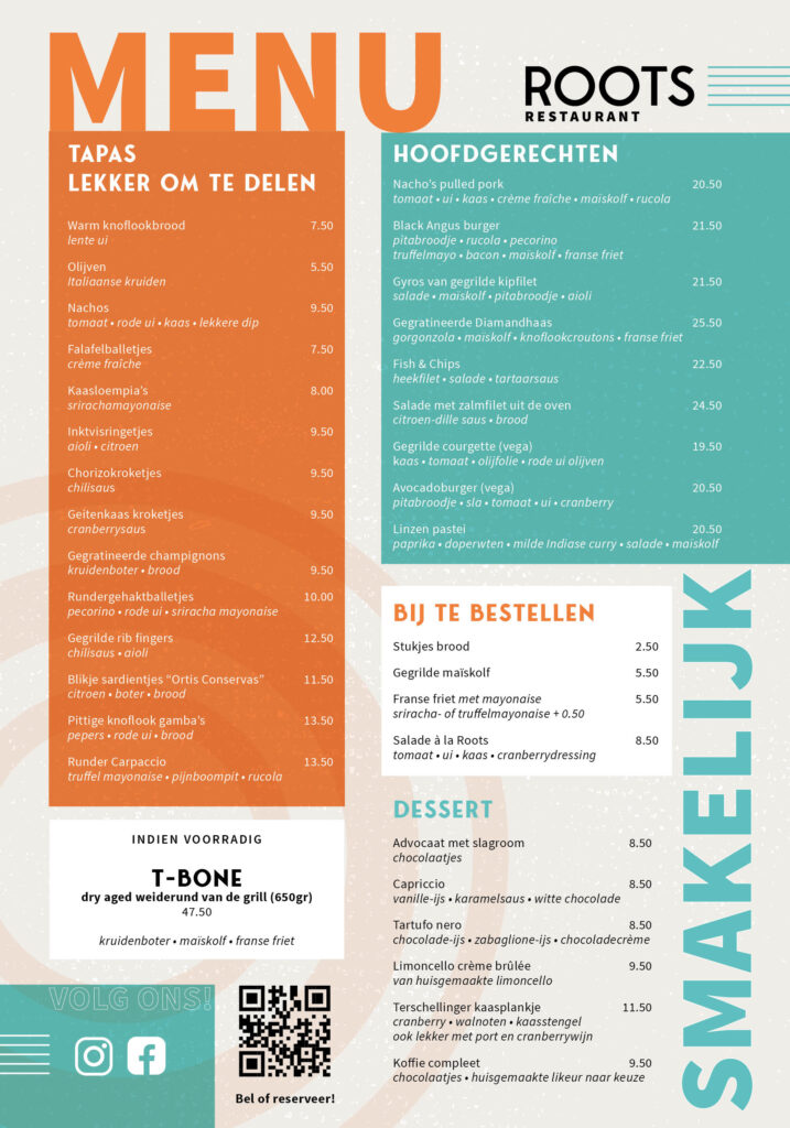In restaurant ROOTS kun je samen genieten van vis-, vlees-, en vega gerechten, ook om lekker te delen. Met een heerlijk glas wijn of (speciaal)bier. Chef-kok Ewald weet iedereen te verrassen met z’n unieke gerechten, desserts en eigen likeuren.
